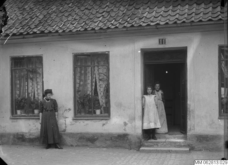 Bostadshus, 1910-tal. I dörren står en äldre kvinna och en flicka på trappa, mellan två stora, gardinförsedda fönster står en yngre kvinna. Blommor och stora väter syns i fönstren.