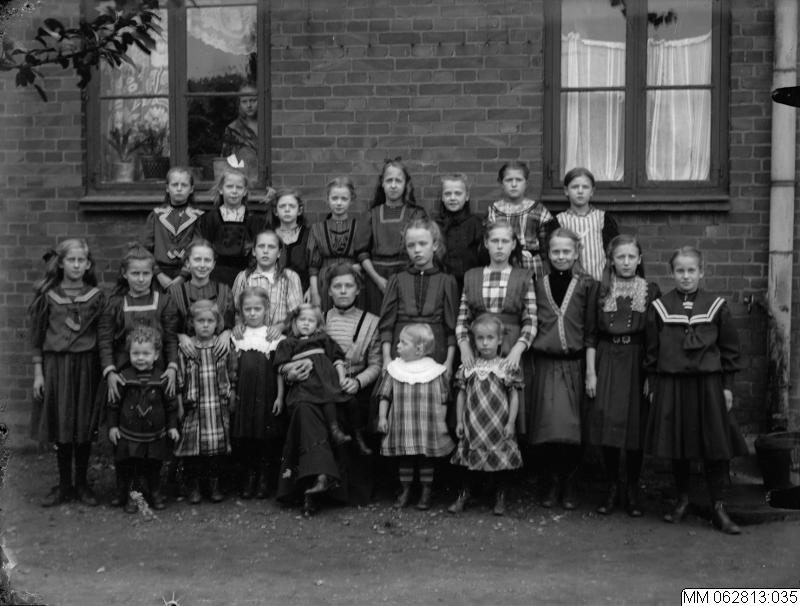 - Stor samling barn i olika åldrar, sannolikt skolbarn, framför skola, 1910-tal Sannolikt fröken i centrum av bilden. Två stora fönster, det vänstra gardinförsett. I fönstret skymtas en kvinna. En trädgren syns i övre högra hörnet.