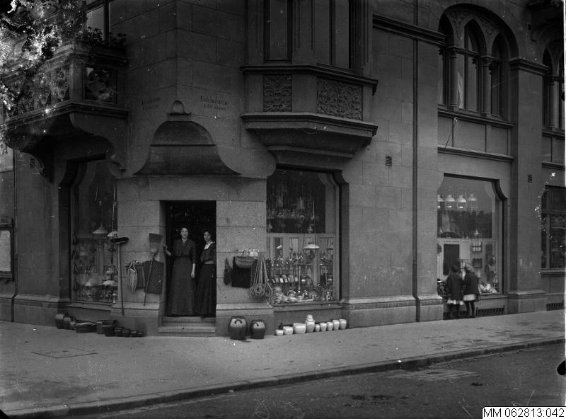 - Ej namngiven husgerådsbutik, i korsningen Ledebursgatan /Amiralsgatan, 1910-tal. Två kvinnor stående i hörningången vid trappa. Skyltfönster på vardera sida med varuutbud, lampor mest framträdande. Övriga varor, som kvastar, krus, mattpiskor, korgar och krukor finns uppställda /upphängda längs sidorna under skyltföntren och vid väggarna. Stora burspråk ovanför skylfönsterna. Vid skyltfönstret till höger i bild står två flickor, tittande på varor i skyltfönster.