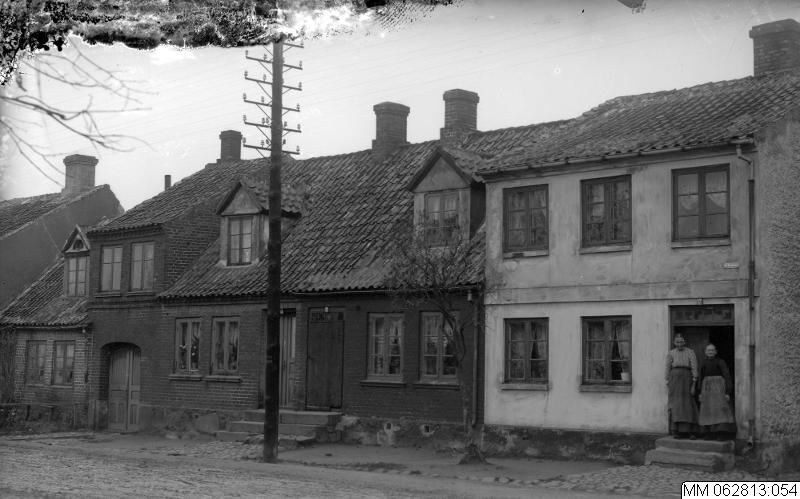 Bostadshus /bostadsområde, kvarteret Herkules, 1910-tal. Till höger i bild står två kvinnor i dörren till bostaden. En elstolpe och kraftledningar står framför bostadshusen.