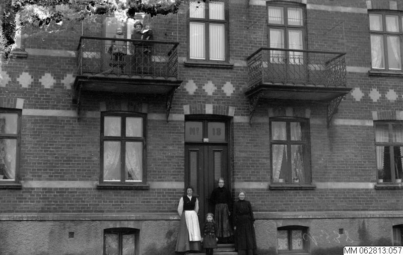 - Tre kvinnor och en flicka stående framför bostadshus med gardinförsedda fönster, 1910-tal. "No. 18" står med stor stil ovanför dörren. På andra våningen, två stora balkonger med räcken. På den vänstra, en kvinna, hållande ett barn i famnen samt en flicka, stående på stol.