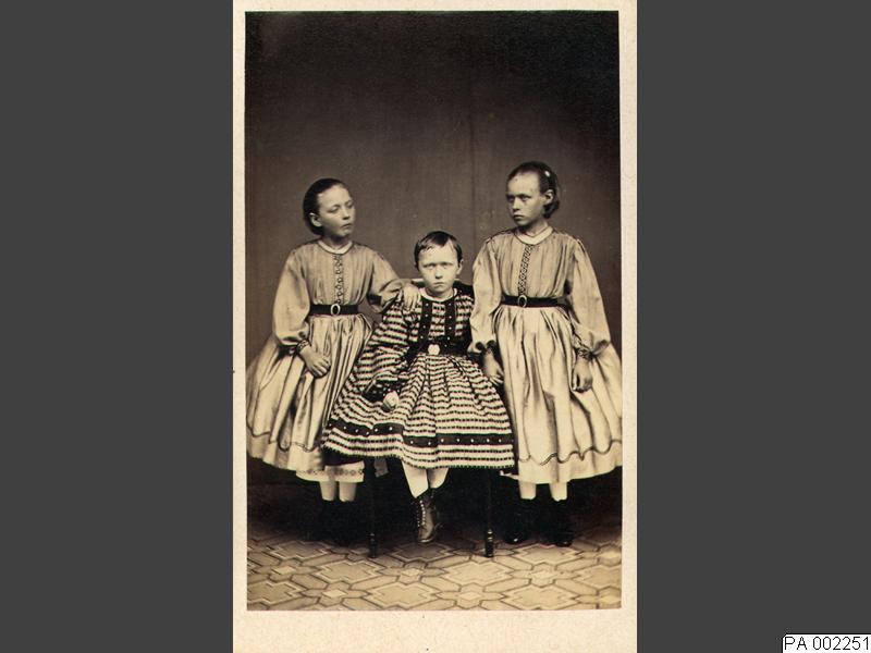 Visitkortsfotografi. Porträtt av systrarna Thora Maria, Edit Augusta och Ida Christina Sjögren.