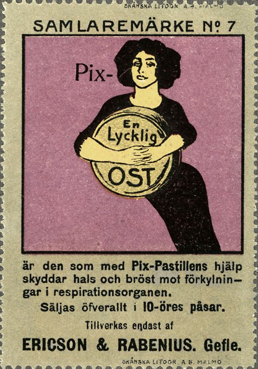 Lila, svart, grått och ljusgrönt tryck på papper. Samlaremärke No. 7. Scen, en kvinna håller i ostpaket.