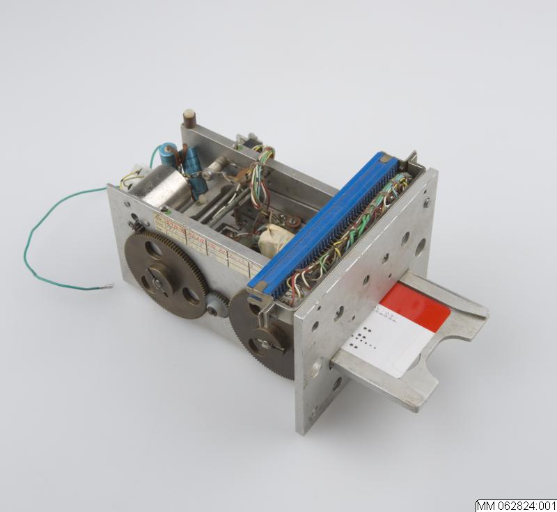 - Kortläsare till sedelautomat (Bankomat). Mekanisk del med korttransoport och elektronik för styrning och avläsning. I släden ligger ett hålkort i plast( CR80) med texten Testkort Nr 1 instansad och med tryckt text Metior AB Malmö/Sweden. På mekanismen sitter en pappersetikett med bland annat datum angivna för Mod. 24/7-72, Contr. 19/6-73, Test 2/5-74 skrivna med tusch- och kulspetspenna.