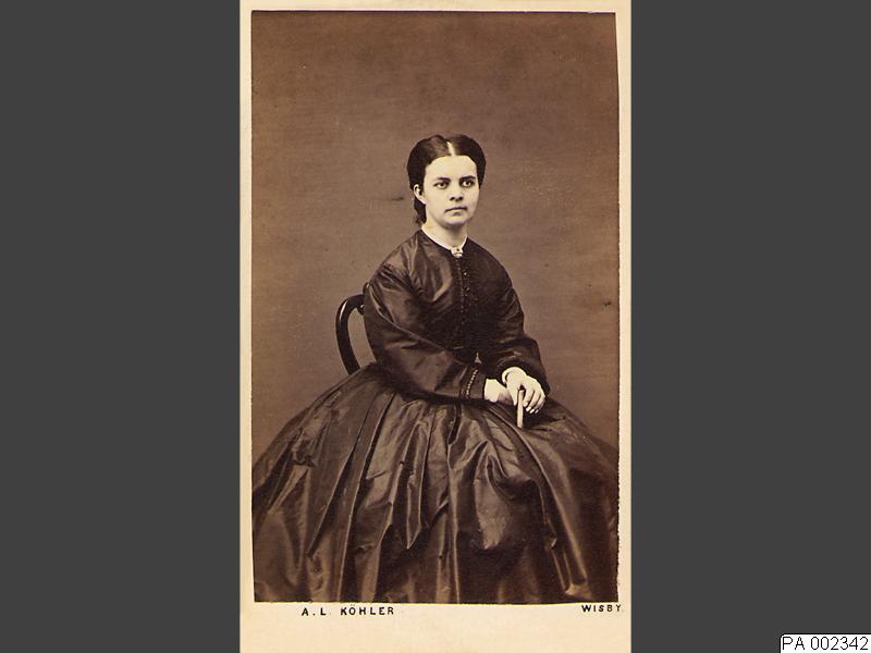 Visitkortsfotografi. Porträtt av Emma Nyströmer, innehavare av damskrädderifirman Fr. V. Tunborg & Co. i Stockholm.