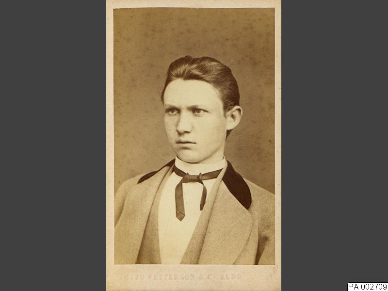 Visitkortsfotografi. Porträtt av läroverksadjunkt Måns Persson som en ung man.