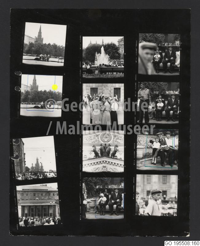 GO 195508:160 :: barn, buss, folksamling, fordon, grupporträtt, man, pojke, spade, stadsbebyggelse, storstäder, teater, ungdom, vägväsen, skulptur