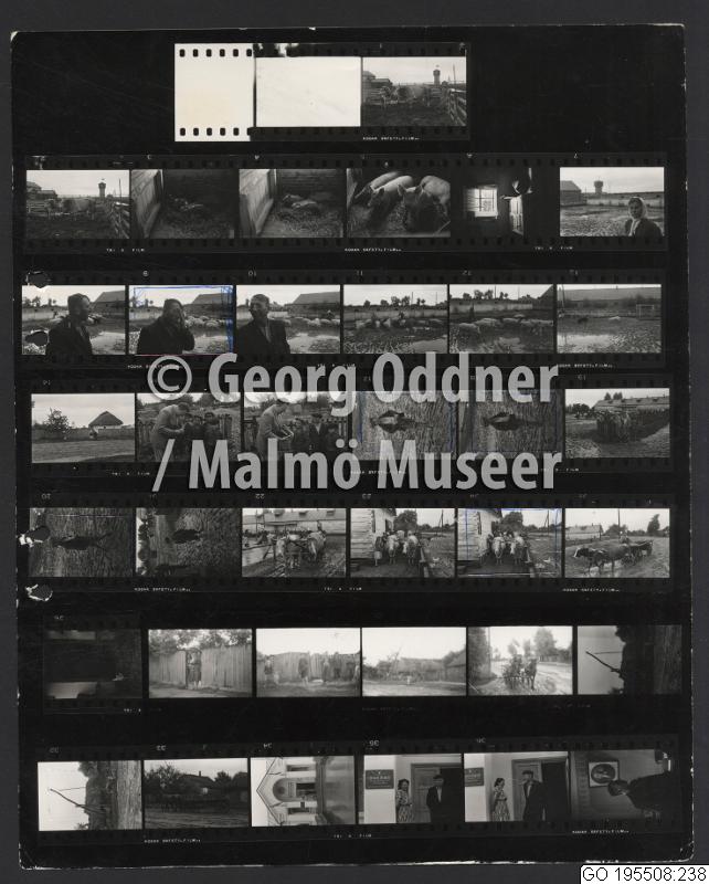 GO 195508:238 :: barnporträtt, dragdjur, gris, hägnad, jordbruk, kvinna, mansporträtt, nötboskap, oxe, pojke, tjur, uthus, vagn