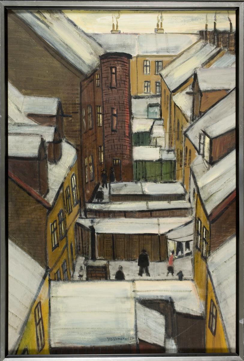 Motivet är sett från ett högt beläget fönster i västra sidan av kv Rostock utmed Stora Trädgårdsgatan. Blicken är riktad åt öster och ger en god överblick av det långsmala kv Rostocks trånga gårdsrum. Utanför vänster bildkant ligger Grönegatan och utanför höger bildkant Lilla Trädgårdsgatan. Det är vinter och snö ligger på taken. Det s.k. "tornet" är ett vanligt rundat trapphus som leder till lägenheternas köksingång.