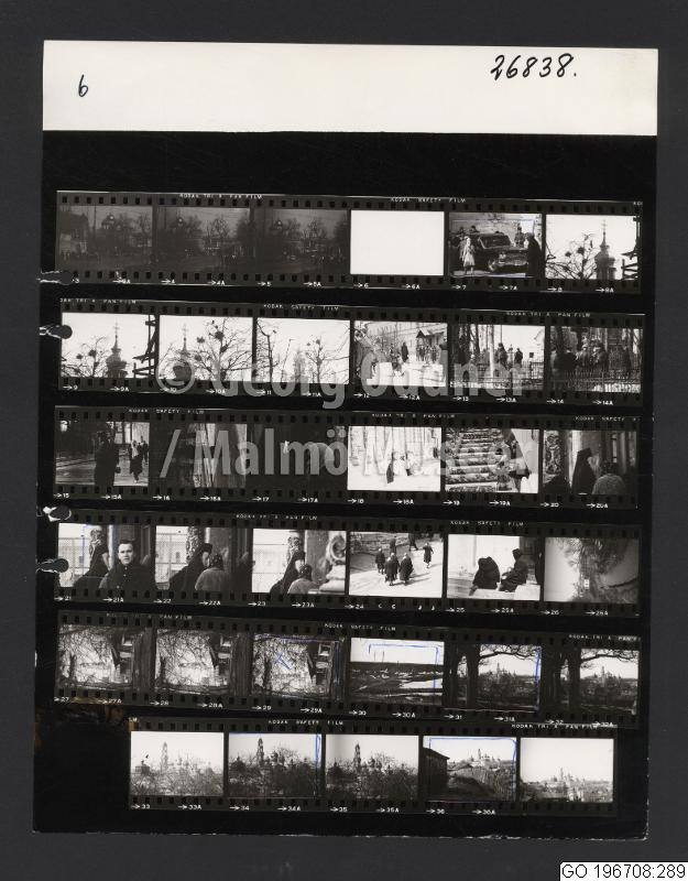 GO 196708:289 :: bil, byggnad, exteriör, grupporträtt, kors, kvinna, kyrkobyggnad, man, pelare, prästerskap, snö, stadsbebyggelse, staket, vy, jordbruksmark, stängsel, stuga
