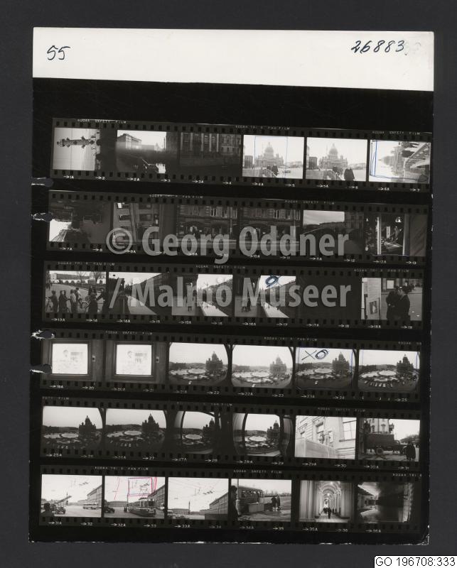 GO 196708:333 :: barnporträtt, bilparkering, bro, byggnad, flod, grupporträtt, interiör, kvinna, man, pelare, spårvagn, stadsbebyggelse, stadstrafik, stadsvy