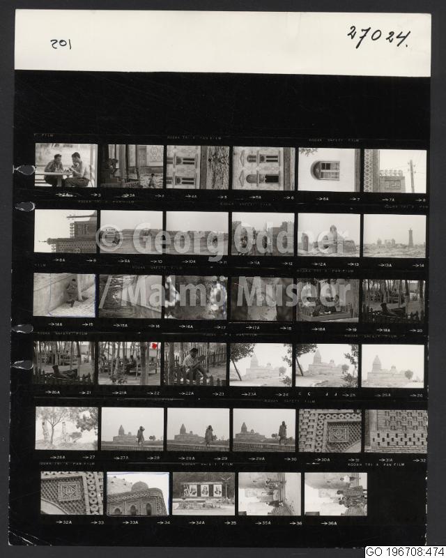 GO 196708:474 :: arkitektur, byggnad, exteriör, fritidssysselsättning, grupporträtt, mansporträtt, skulptur, träd