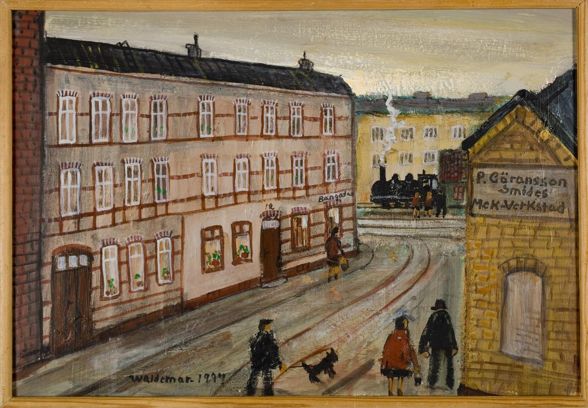 - Vi befinner oss i korsningen Bangatan / Ahlmansgatan på Möllevången och vänder blicken åt söder, mot Spårvägsgatan. I vänstra bildhalvan ser vi hörnhuset Bangatan 12, ett rosafärgat trevåningshus med vita fönsterbågar och ett svart tak. I höger bildkant syns den gula tegelgaveln och skylten till "P. Göransson Smides Mek - Verkstad" i kv Hedvig. I fonden skymtar man på andra sidan Spårvägsgatan ett ånglok vid Södervärns station och bakom denna en gultonad hyreshuslänga. På gator och trottoar syns ett halvt dussin människor flanera förbi.