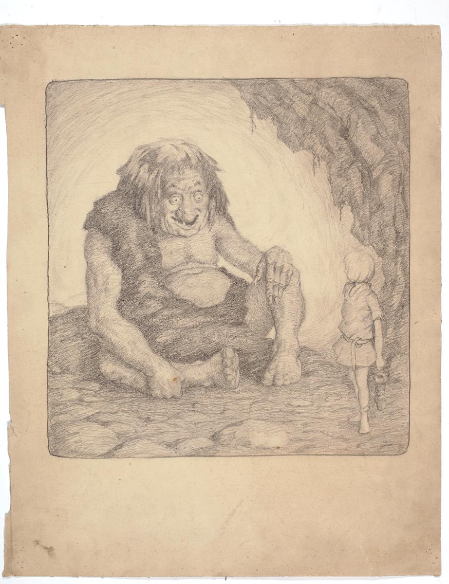 Blyertsillustration. Ett jättelikt troll sitter i en grotta och tittar storögt på en liten pojke