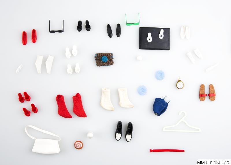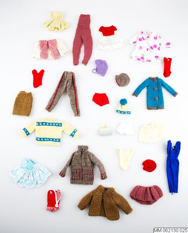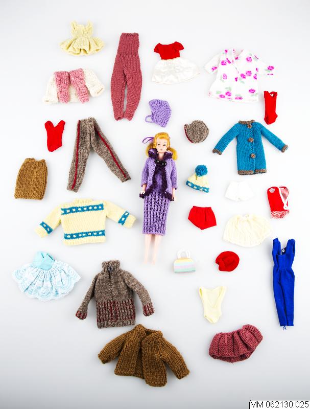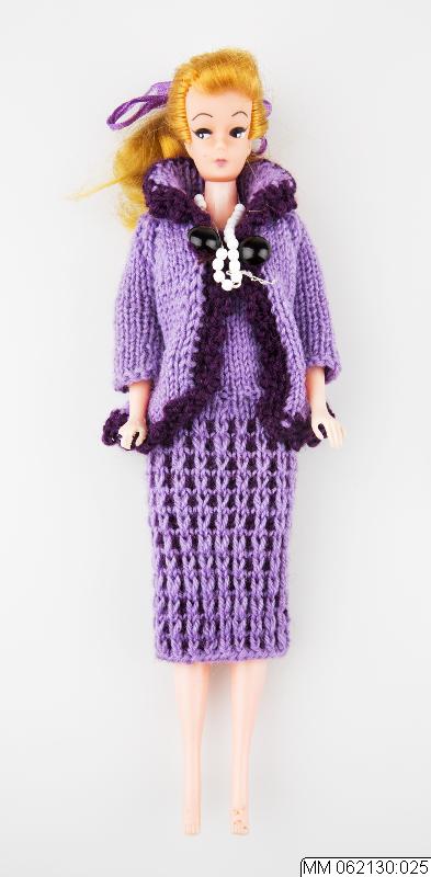 Docka, "Barbiekopia". Av formpressad hudfärgad plast, rörliga armar, ben och huvud. Blont syntethår. Iklädd lila hemstickad klänning och lila kofta.