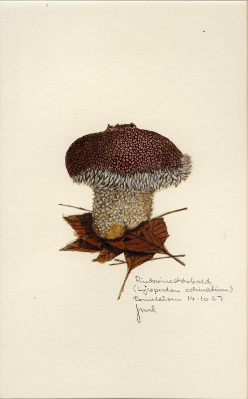 Handskriven text under målningen: Pindsvinestövbold / (Lycoperdon echinatum) / Romeleåsen 14-10-67 / Juul