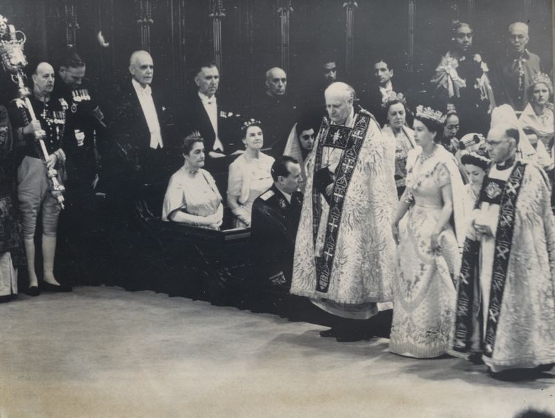 Text på framsidan: Kröningen. Drottningen skrider fram i Westminster Abbey ledsagad av två präster. T.v. samväldets ministrar. Copyright: Pressens Bild AB Stockholm 2653 REU