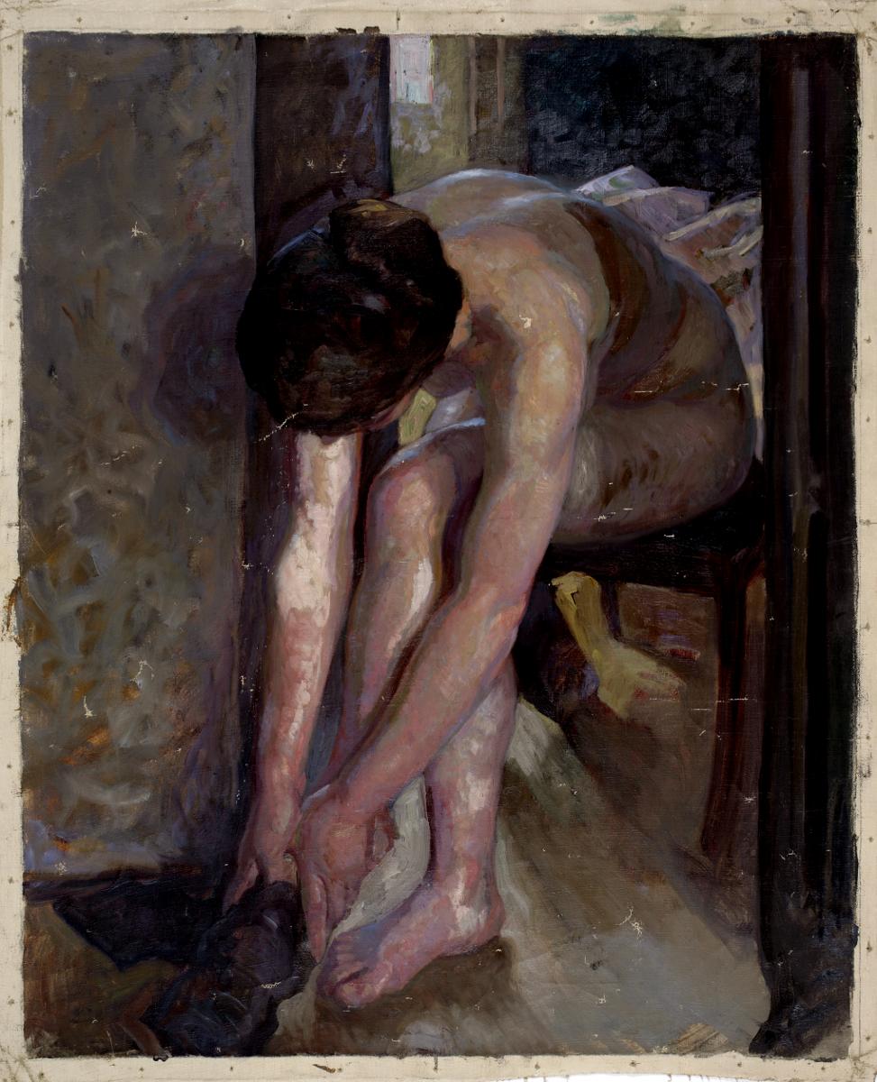 Scenen visar en naken kvinna som sitter på en pall och böjer sig ned för