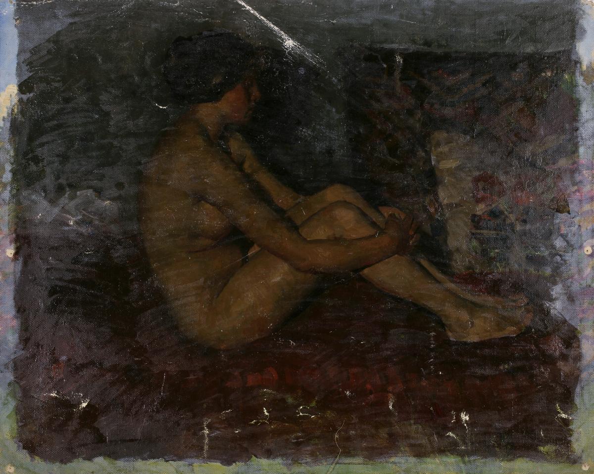 long, uppkrupen med armarna om knäna, målad i profil. Möjligen är det en av Einar Bagers Parismodeller, och målningen bör då vara tillkommen mellan 1910 och 1912.