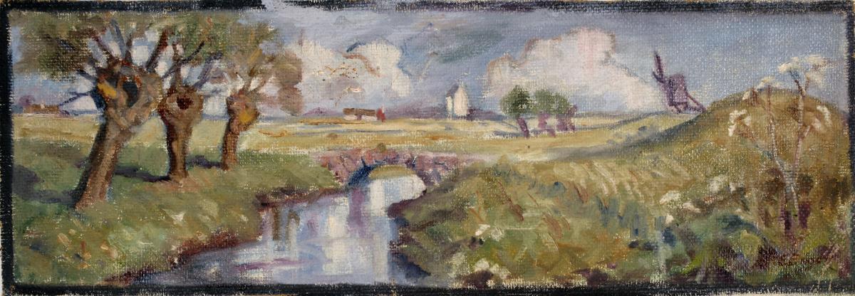 Målningen visar ett öppet landskap med gårdar, en kyrka och en kvarn i bakgrunden. I förgrunden syns tre hamlade pilar rada upp sig längs en å. Över ån löper en liten stenbro.