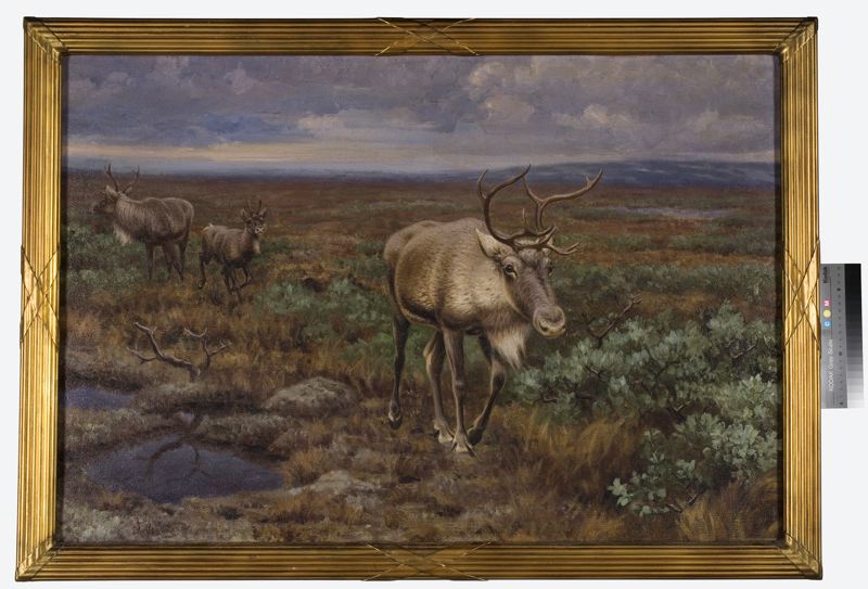 Oljemålning av Olof Gylling. Motiv: Tre renar i landskap. I testamentet står att motivet är "tre älgar".