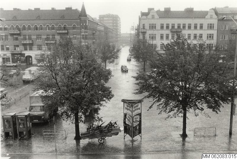 MM 062083:015 :: hus, byggnad, byggnader, bil, bilar, telefonkiosk, telefonkiosker, träd, torg