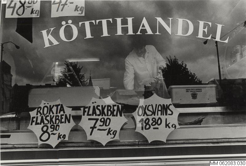MM 062083:030 :: kötthandel, kötthandlare, expedit, expediter, skyltfönster, skylt, skyltar, erbjudande
