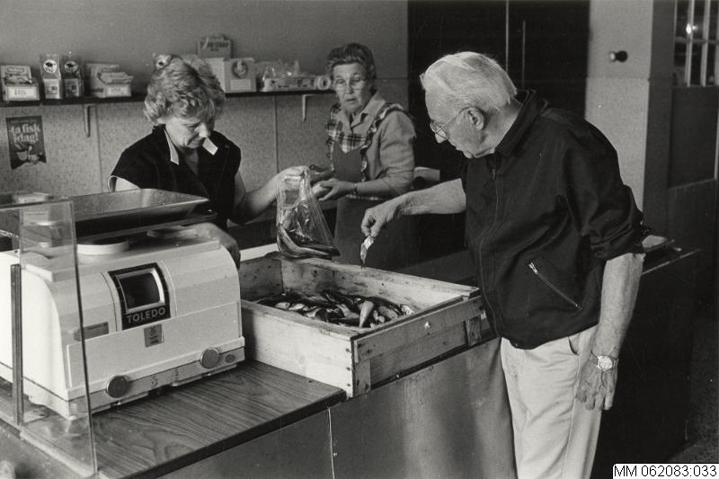 MM 062083:033 :: fiskaffär, fiskaffärer, expedit, expediter, kvinna, kvinnor, kund, kunder, sortiment, utbud, butiksinteriör, butiksinteriörer, fisk, våg