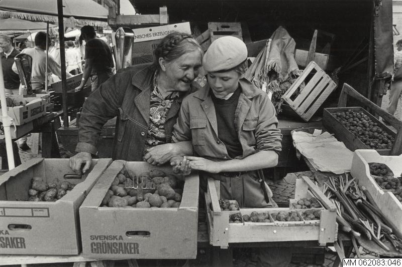 Äldre dam och pojke vid potatisförsäljning på Möllevångstorget.