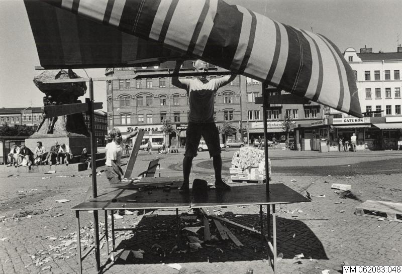 MM 062083:048 :: torghandel, torghandlare, torgstånd, hus, byggnad, byggnader, stängning, osålda varor, man, män, person, personer, nedmontering, torg