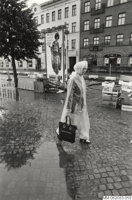 MM 062083:058 :: vattenpöl, vattenpölar, kvinna, kvinnor, regnkappa, regnkappor, reklamskylt, reklamskyltar, regnkläder, torg