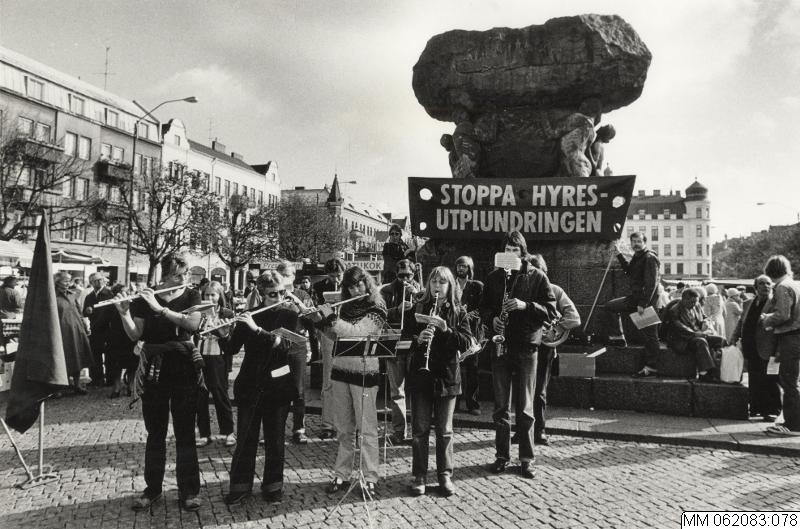 - Musikanter med skylt "Stoppa hyresutplundring" framför statyn Arbetets ära av Axel Ebbe.