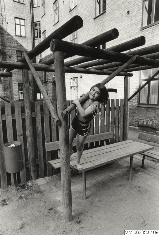 MM 062083:109 :: klättrande barn, flicka, flickor, gård, gårdar, staket, bänk, bänkar, barn
