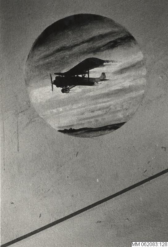 MM 062083:128 :: väggmålning, väggmålningar, flygplansmotiv, konstverk, flygplan, propellerplan, himmel