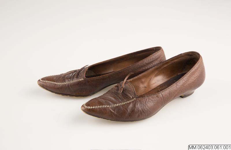 Sko med låg klack, spetsig tå. Tåparti med stickningar och dekorsnörning av skinnband.