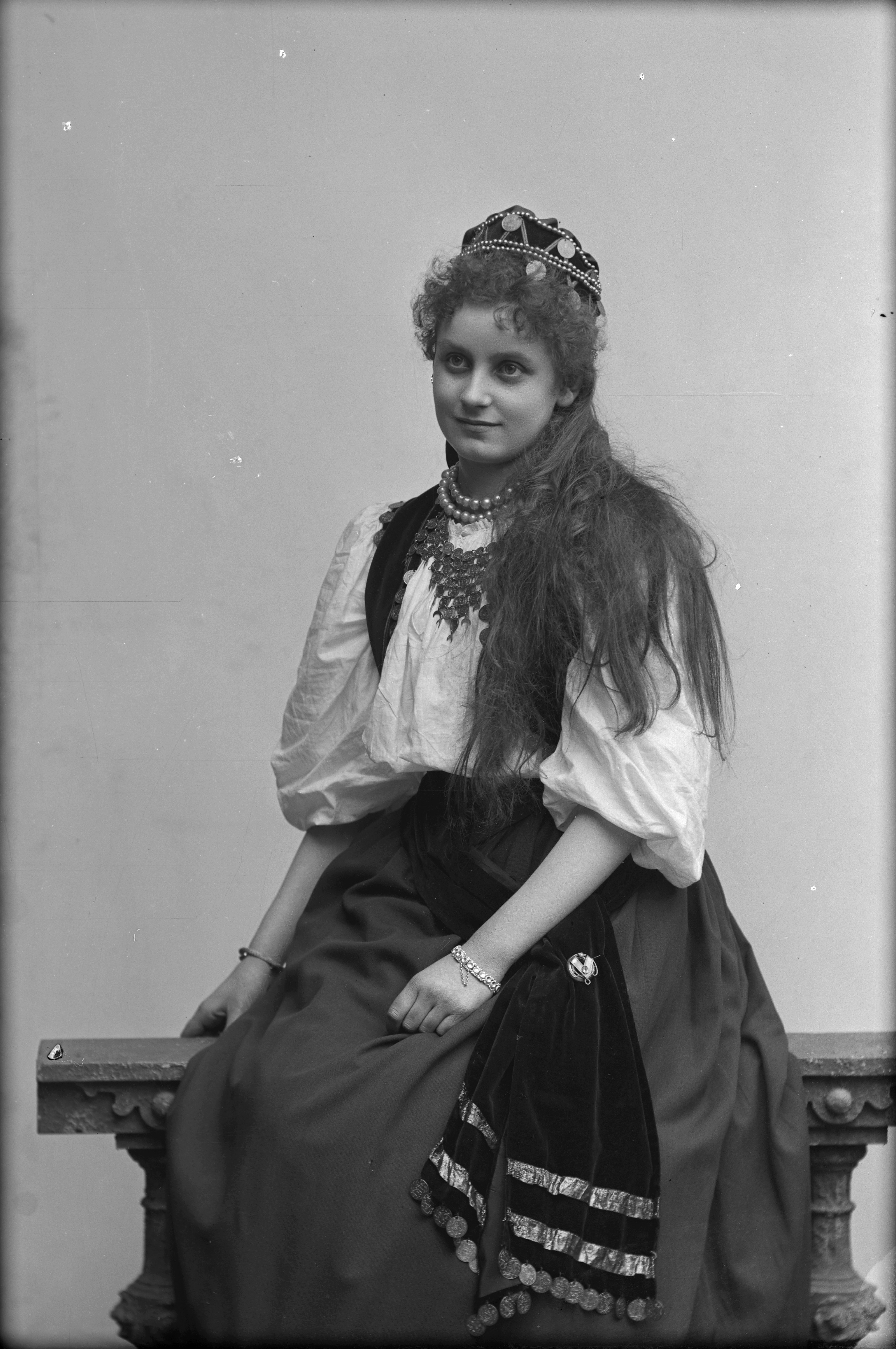 Porträtt i helfigur av Maria Persson, iklädd folkdräkt, sittande på stenstaket.