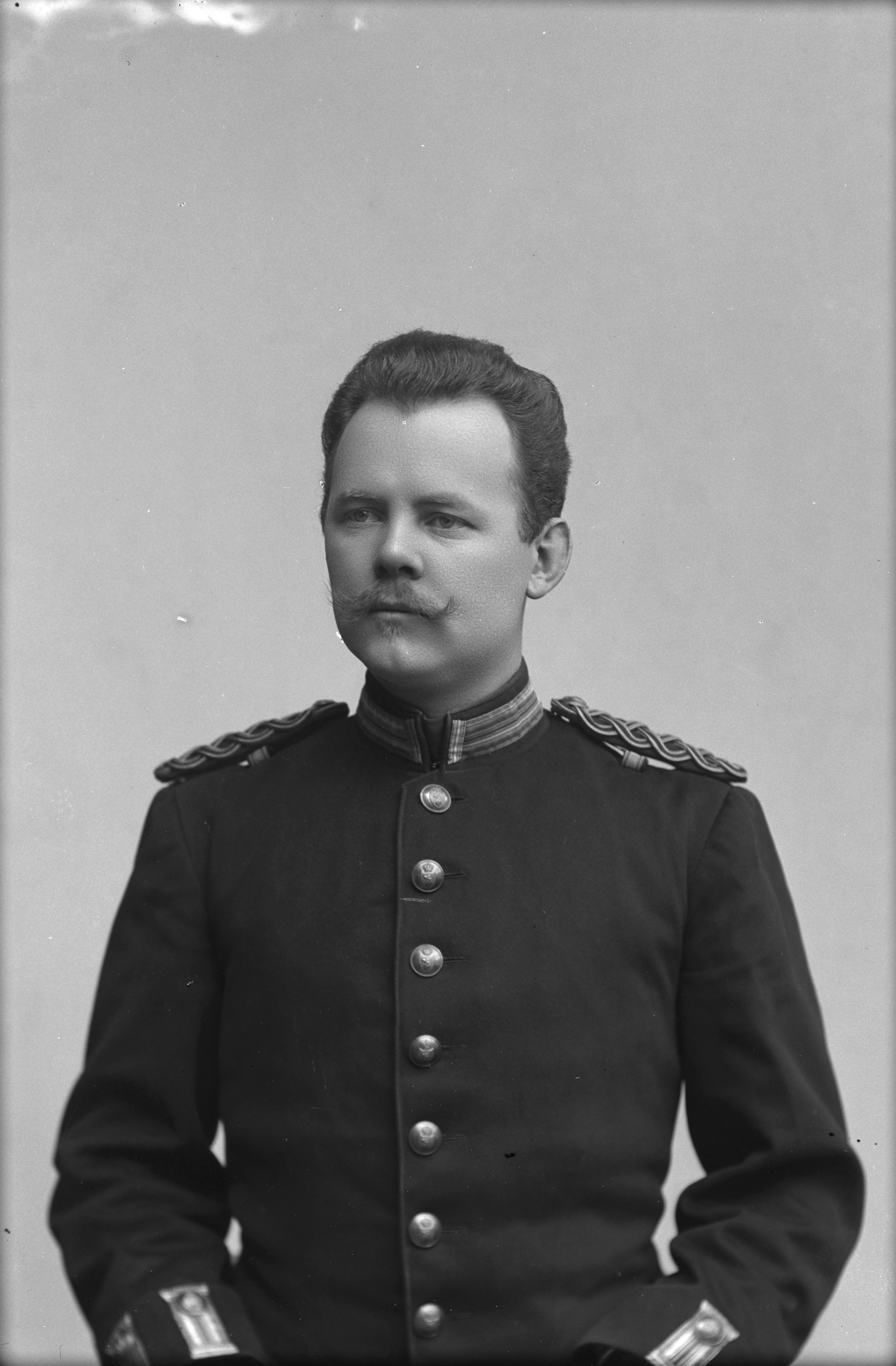 Porträtt i halvfigur av herr Björk, iklädd yrkesuniform, möjligen fartyg /sjöfart eller militärväsen.