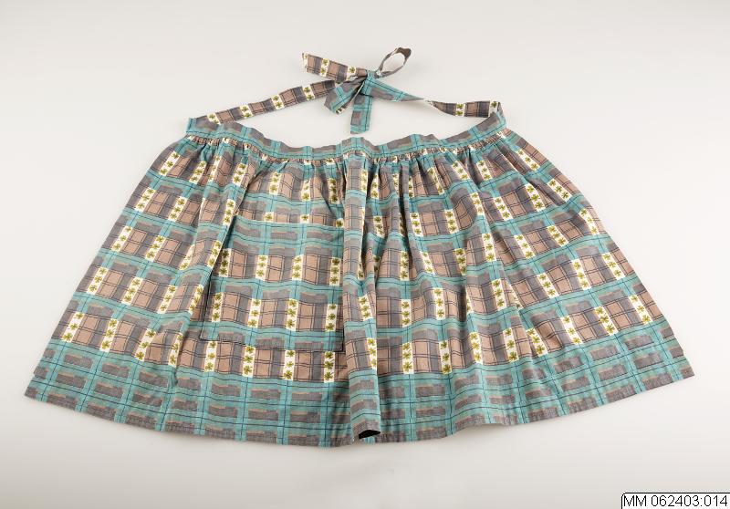 Midjeförkläde brunt, turkos och grå rutos med bårder av gröna fyrklöver. En påsydd sidoficka och knytband i förklädets tyg.
