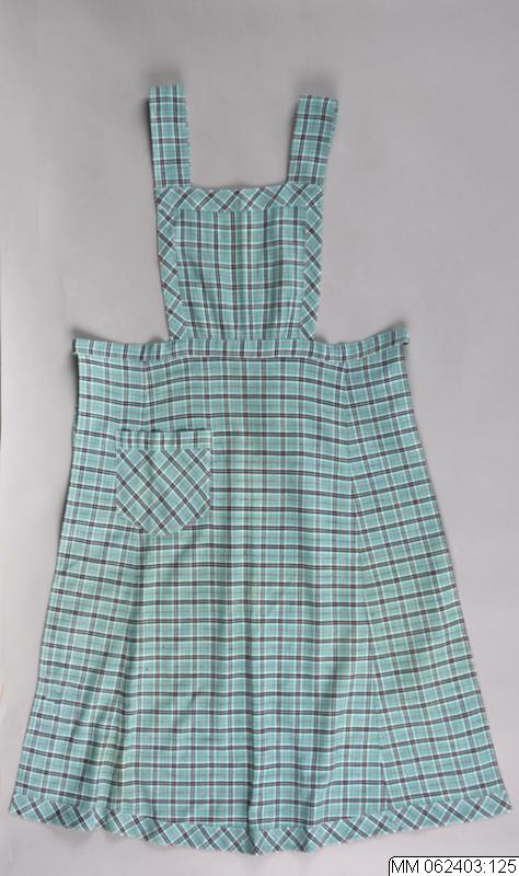 Köksförkläde med bröstlapp och och band att knyta runt halsen. Sytt av tre våder med påsydd sidoficka och knytband bak i midjan.