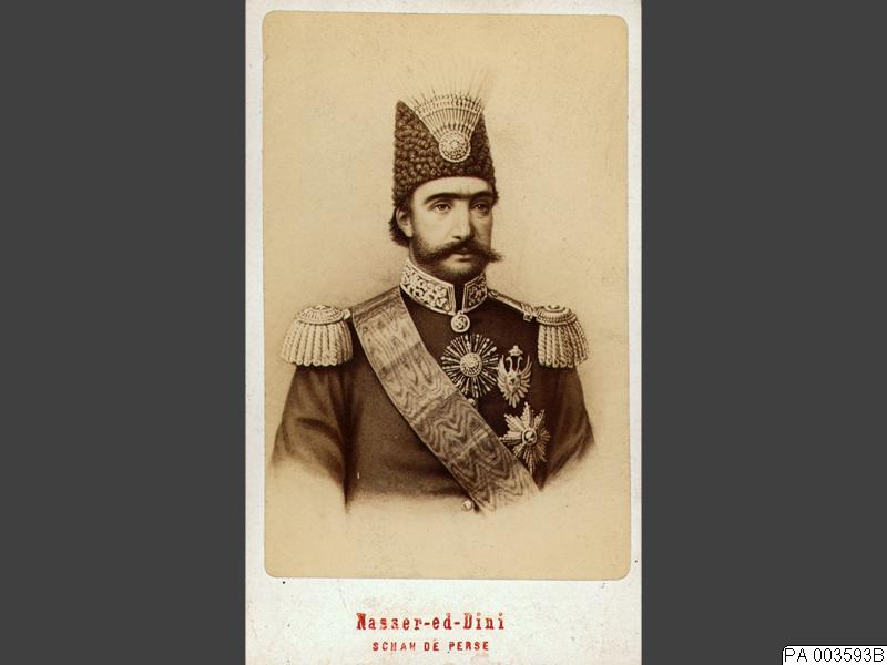 Visitkortsfotografi. Avfotograferad målning. Porträtt av Nasr ad-Din, schah av Iran.