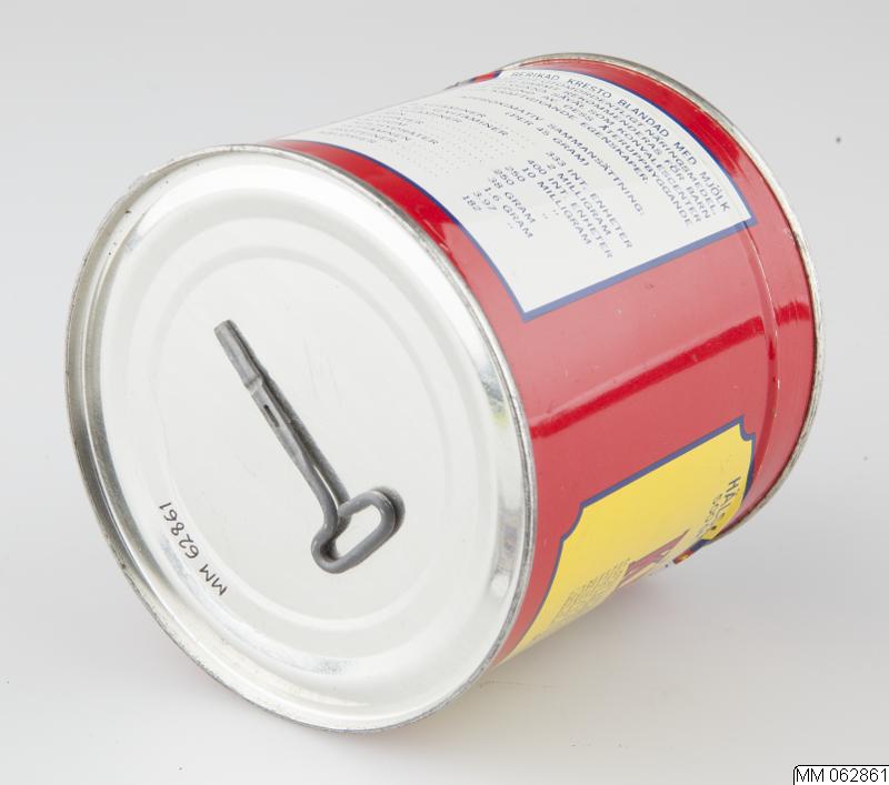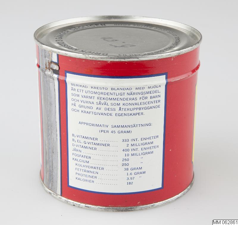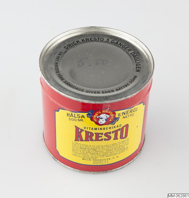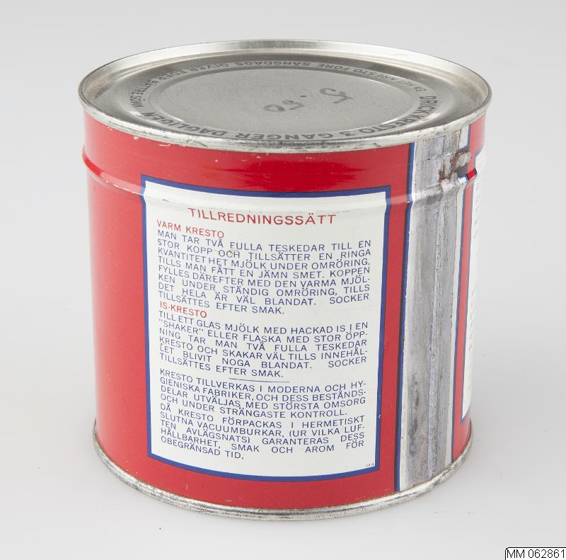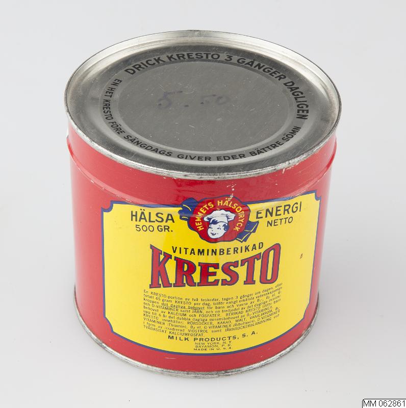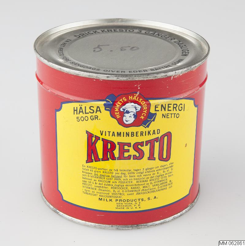 - Konservburk i plåt med bland annat texten: Vitaminberikad Kresto. Hemmets hälsodryck. Hälsa energi 500 gr. netto. Tillredningssätt och innehållsförteckning. På ovansidan står: Drick Kresto 3 gånger dagligen. En het Kresto före sängdags giver eder bättre sömn. Med tusch står 5.50. I botten sitter en nyckel för öppning av burken.