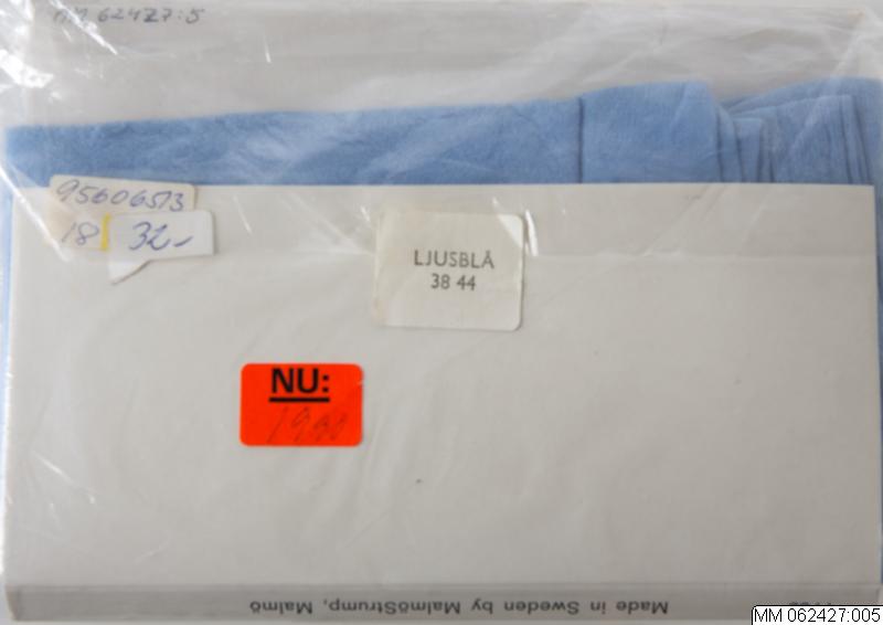 Strumpbyxor i obruten förpackning av plastpåse och pappersomslag.