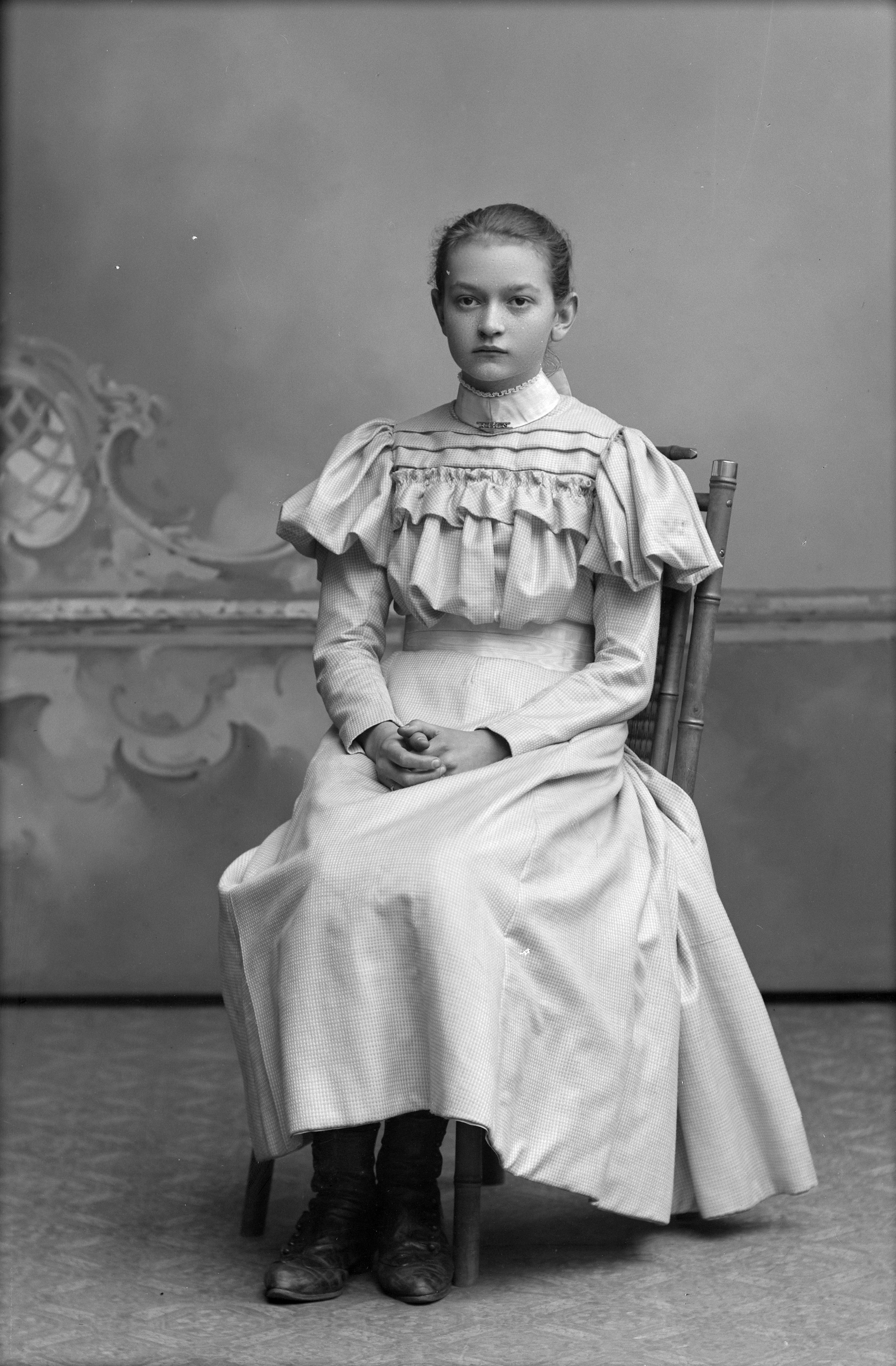 Porträtt i helfigur av Hildur Johnsson, butiksbiträde i smöraffär, sittande på stol.