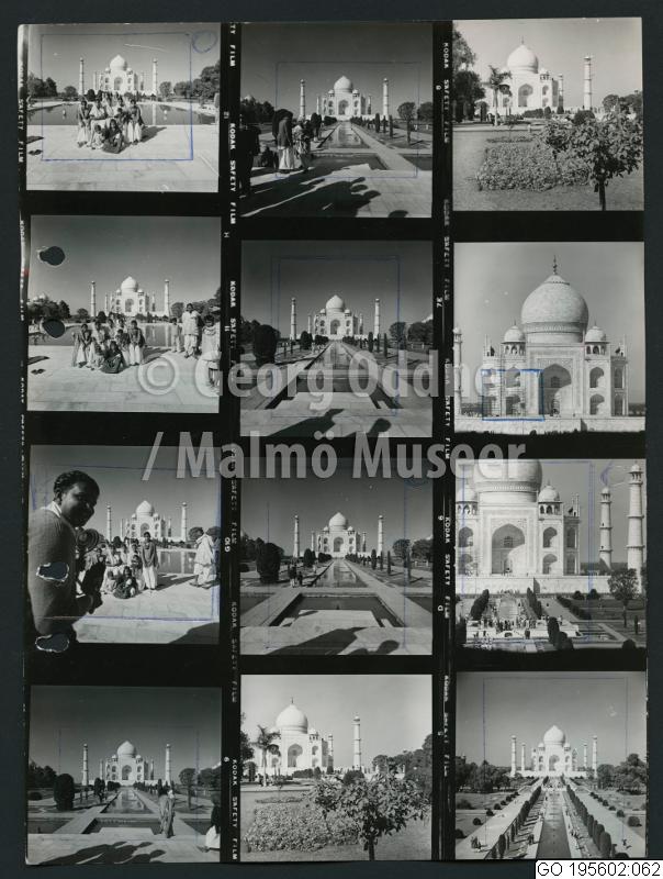 GO 195602:062 :: barn, byggställning, damm, grupporträtt, kvinna, man, tomt, trädgård, turist, mausoleum, storstäder, huvudbonad, kvinnoklädsel, mansklädsel