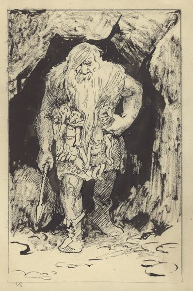 Bilden föreställer en jätte (Oden) med argsint utseende som kommer utklivande ur en grottöppning med ett spjut i ena handen och med livlösa kroppar hängande vid bältet.