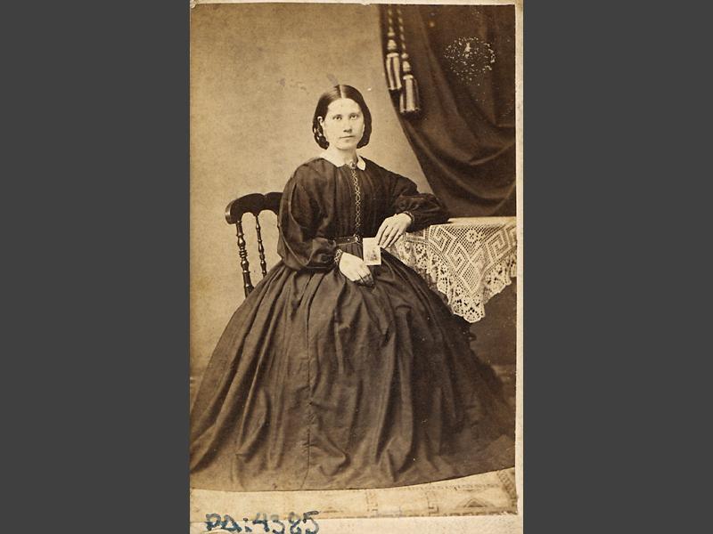PA 004385 :: kvinna, klänning, stol, bord, draperi, tofs