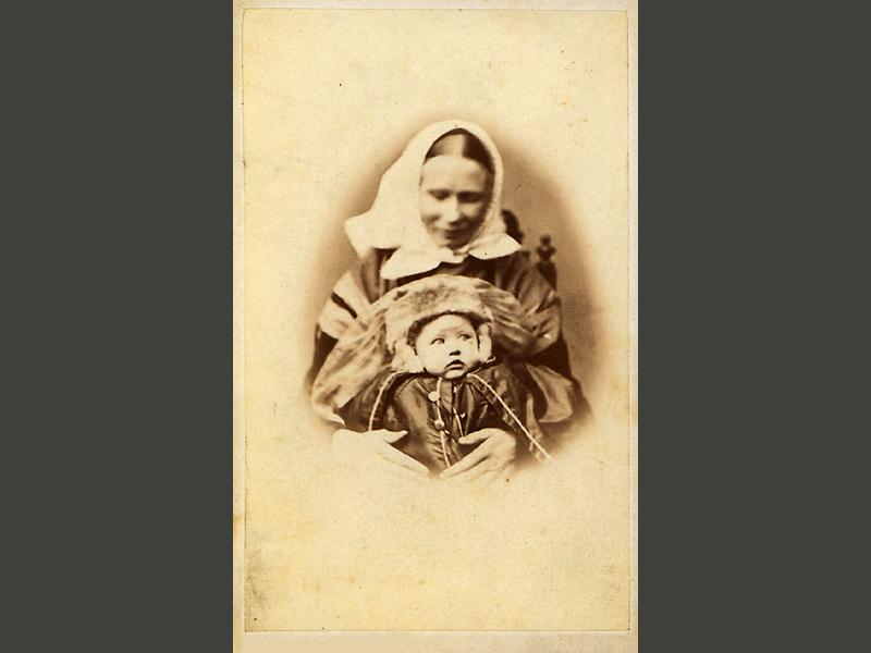 Visitkortsfotografi. Porträtt av lärarinnan Elisabeth Falck som liten flicka. Hon sitter i knäet hos sin amma.