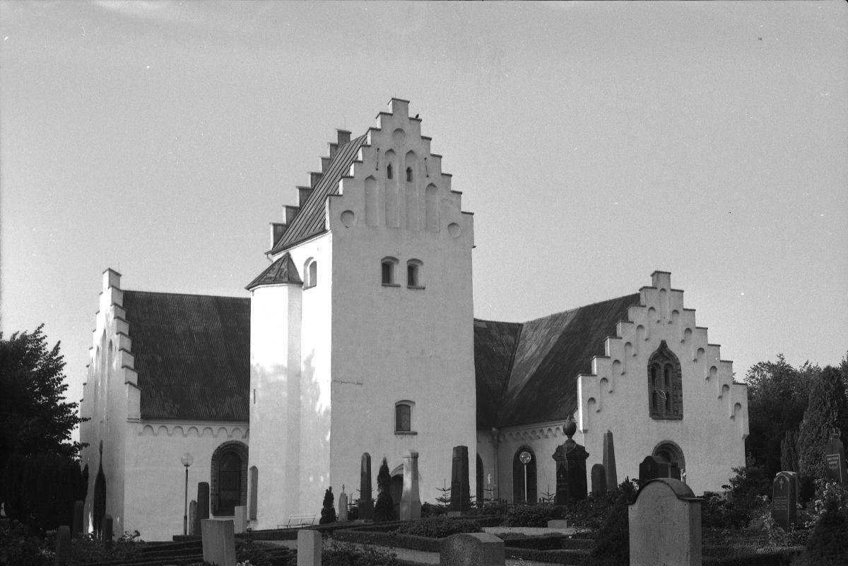 Utomhusbild som visar Oxie kyrka. Gravstenar i förgrunden.