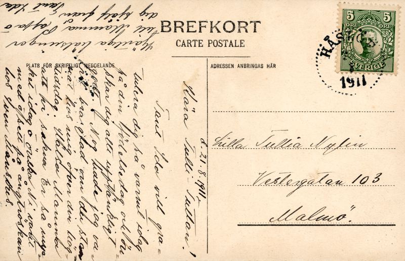 Brevkort adresserat till Tullia Nylin, Vestergatan 103, Malmö. Daterat och poststämplat i Håstöf 21/8 1911. Födelsedags gratulation från Tant Ida.