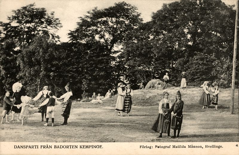 Bild: Svartvit foto från badorten Kempinge med folkdräktsklädda människor dansande i ring och i par.